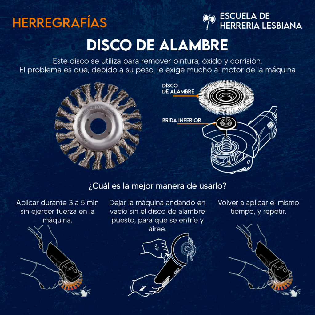 Discos de alambre: estos discos son una buena opción si buscás mayor durabilidad del disco, ya que se gastan más lentamente que los discos de fibra. Sin embargo, como son pesados, exigen más esfuerzo al motor de la máquina. Recomendamos utilizarlos durante entre 3 y 5 minutos, retirar el disco y dejar la máquina en funcionamiento sin el disco de alambre para que se enfríe y airee, y luego volver a aplicar el mismo tiempo.