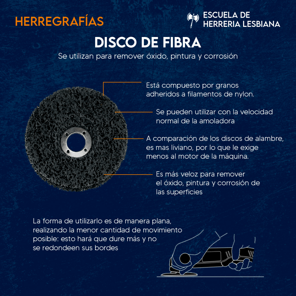 Discos de fibra: estos discos están compuestos por granos adheridos a filamentos de nylon, lo que los hace muy livianos. Podés utilizarlos con la velocidad normal de la amoladora, aunque es ideal utilizarlos con velocidad baja en caso de tener una amoladora regulable. Como son livianos, exigen menos al motor de la máquina que los discos de alambre. Para utilizarlos, realiza movimientos planos y con la menor cantidad de movimiento posible para evitar que se redondeen sus bordes. (acá tenés un tutorial)