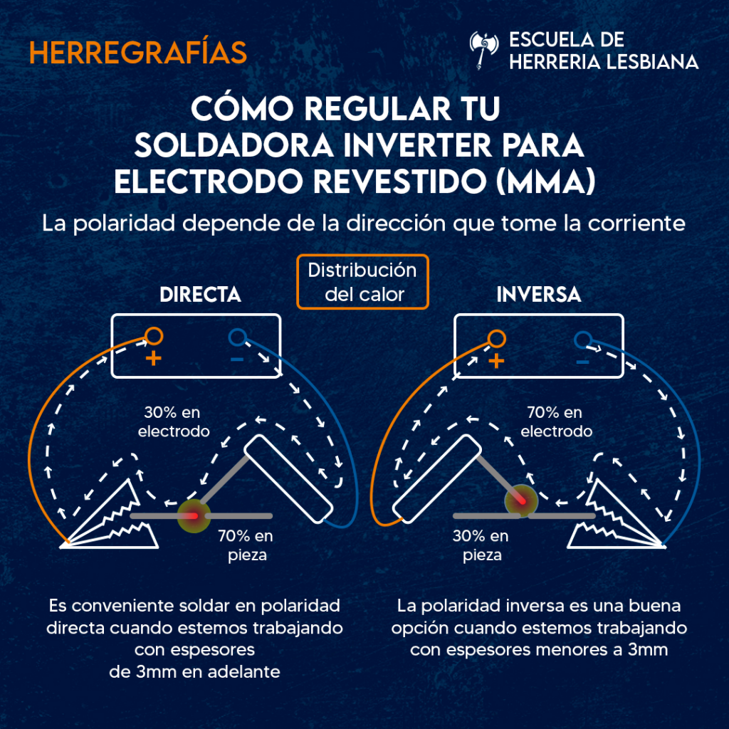 Las soldadoras inverter ofrecen la posibilidad de invertir la polaridad para soldar en polaridad directa o inversa.